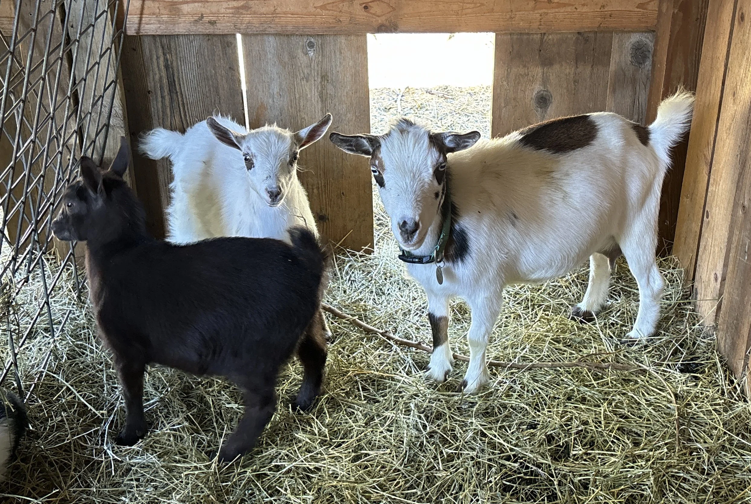 This is Prairie Creek Tillie. DOB 5/9/2023. She is a proven doe and is currently in milk. She has been training on the milking stanchion. She is pictured with her two kids from this year. Her daughter (brown doeling in the front) is still available. $350 with registration.